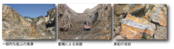 母岩の中で銀色に光って見える部分が黒鉛で鉱石全体の内、10%程度です。